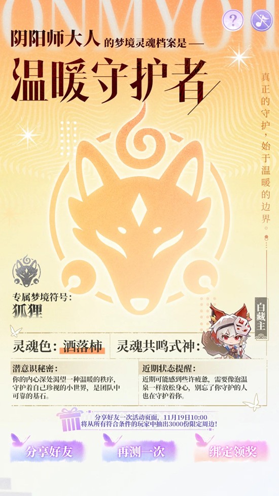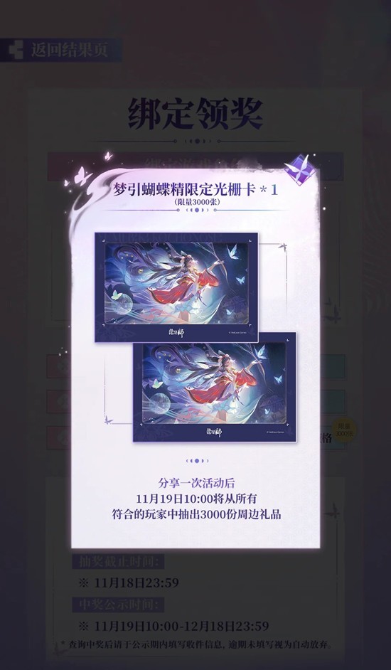 ※11月18日23:59前首次分享活动还可获得限定周边抽奖机会。11月19日10:00,将从满足参与条件的阴阳师大人中,随机抽取3000名获得「梦引蝴蝶精限定光栅卡」*1。