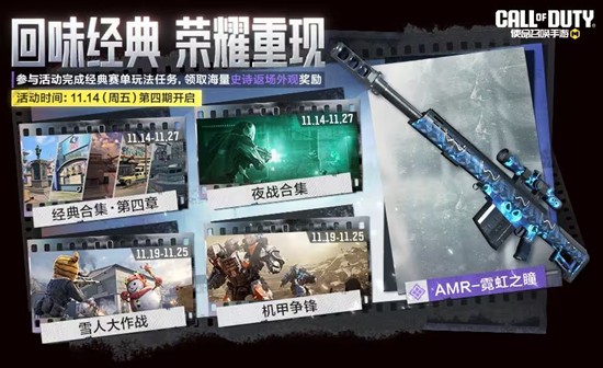 11月14日(本周五),2023怀旧地图合集经典回归,战士们参与活动完成经典玩法任务,就能领取史诗级武器AMR-霓虹之瞳等海量史诗返场外观奖励啦!