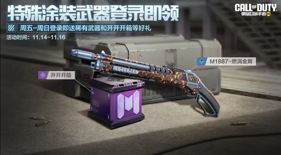 11月14日(本周五),周末登录礼活动上线。战士们周末登录游戏,就能轻松获得稀有级武器M1887-燃涡金屑、开开开箱和福利点券。