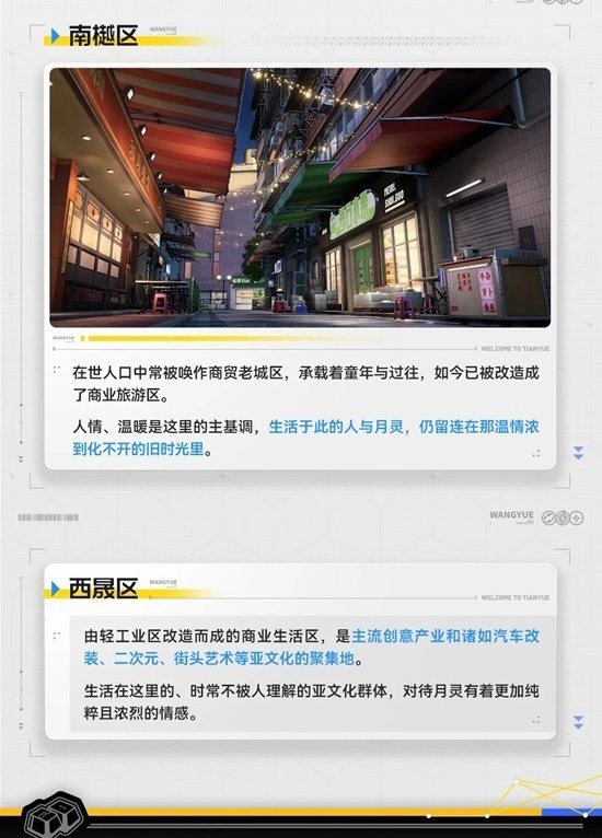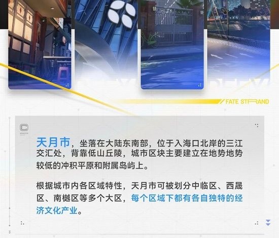 根据城市内各区域特性,天月市可被划分中临区、西晟区、南樾区等多个大区,每个区域下都有各自独特的经济文化产业。
