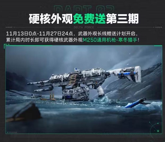 武器外观长线赠送计划开启,累计局内时长即可获得硬核武器外观M250通用机枪-寒冬猎手。