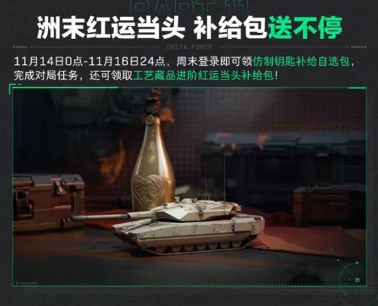 周末登录即可领取仿制钥匙补给自选包,完成对局任务,还可领取工艺藏品进阶红运当头补给包。