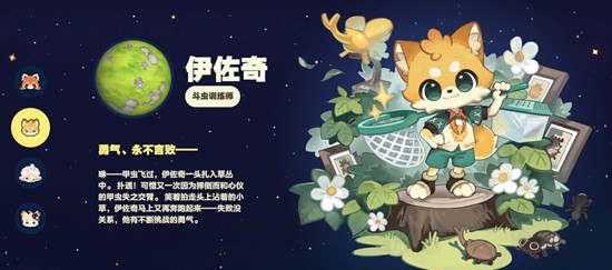 伊佐奇同样以狐狸为原型,但与云果不同的是,他是一只浅黄色的活泼狐狸,职业设定为斗虫训练师。在星布谷地的野外探索中,他能协助玩家驱赶有害昆虫,同时使用捕虫网捕捉稀有虫类。他阳光开朗的性格为星布谷地的冒险旅程增添了不少活力。无论是日常采集还是深入未知区域,伊佐奇都是值得信赖的同行者。