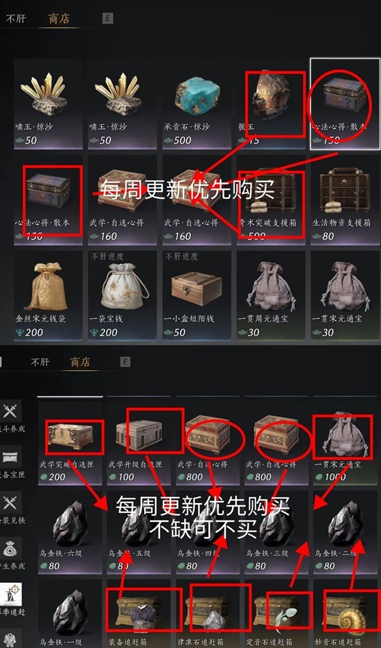 提升第三点武库:追赶商店每周材料必买,材料不要用在51等级,61、71、81、86需求较多,材料注意少量分配使用,只要达到黄字数值满就行,每周都可兑换
