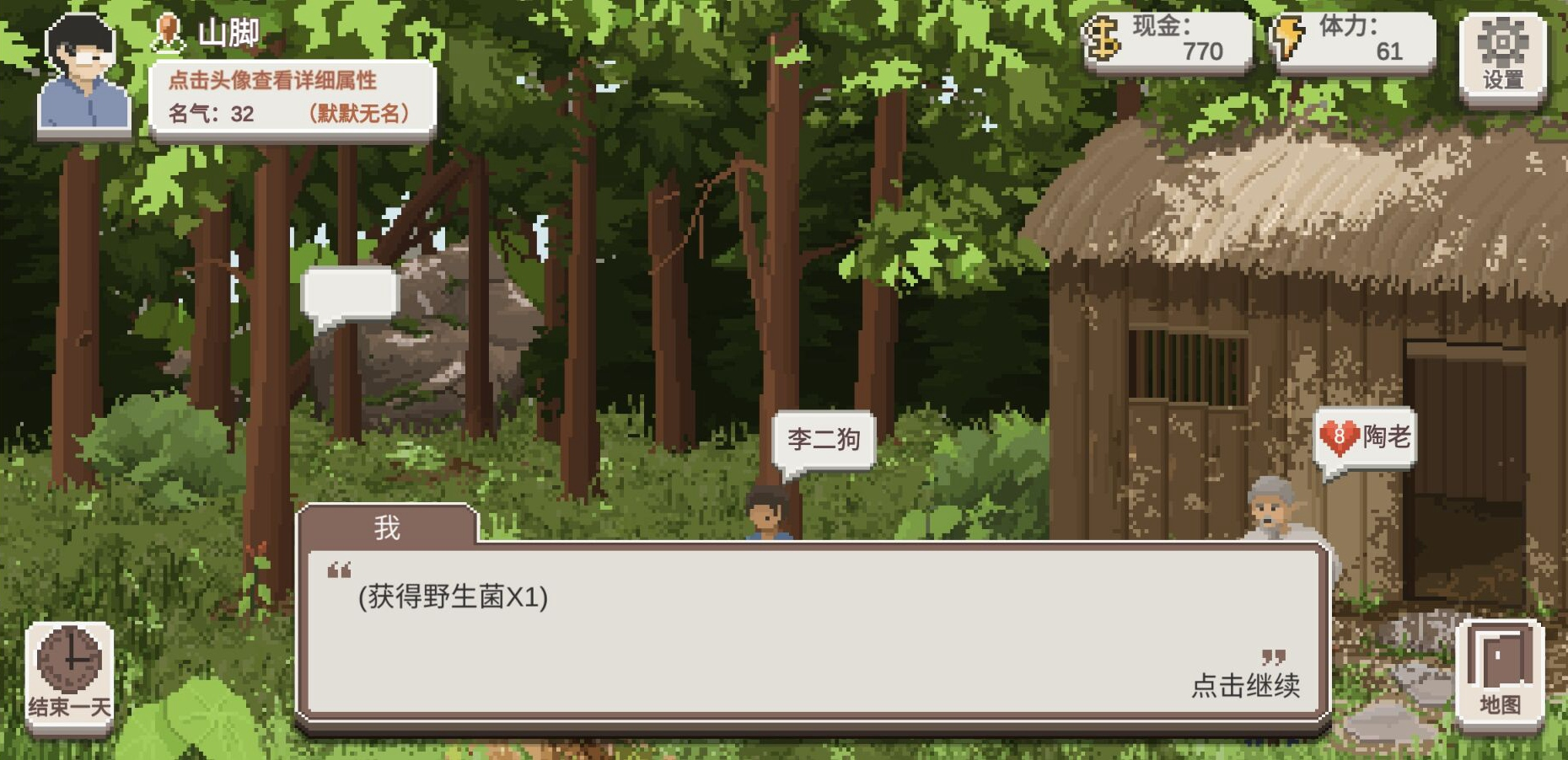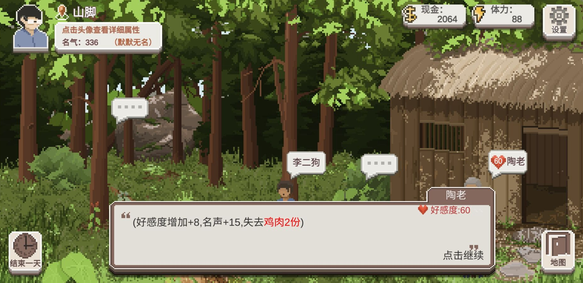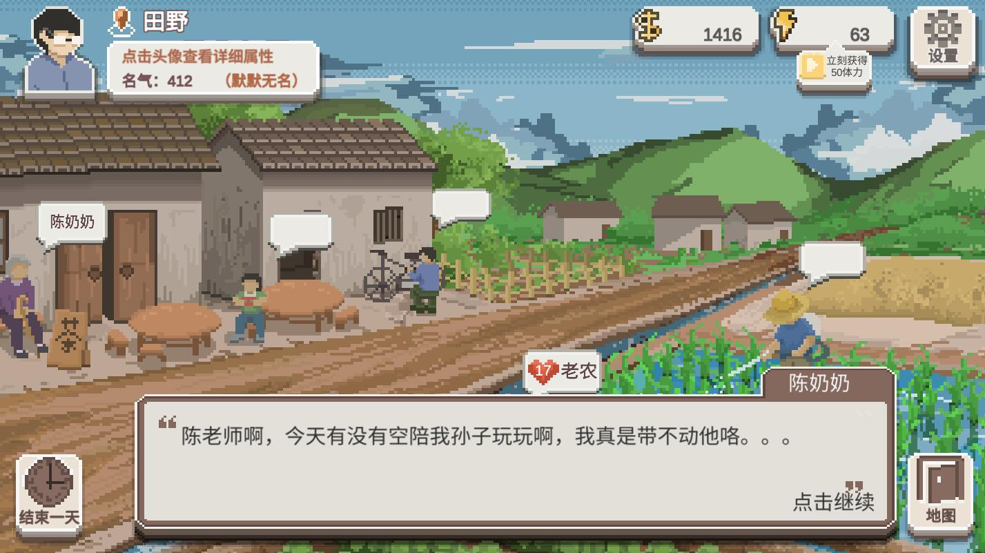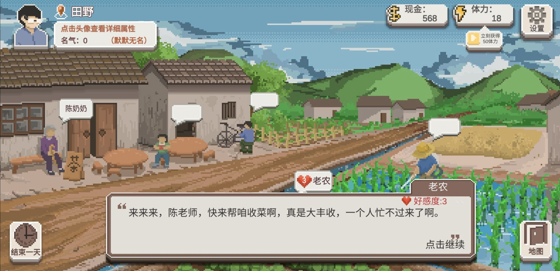 和【陈奶奶】花费5精力谈心,有概率获得【名声+5】的奖励,有时候聊完也没有奖励如果没有体力也可以花8块钱找【陈奶奶】喝个茶,恢复15点精力。