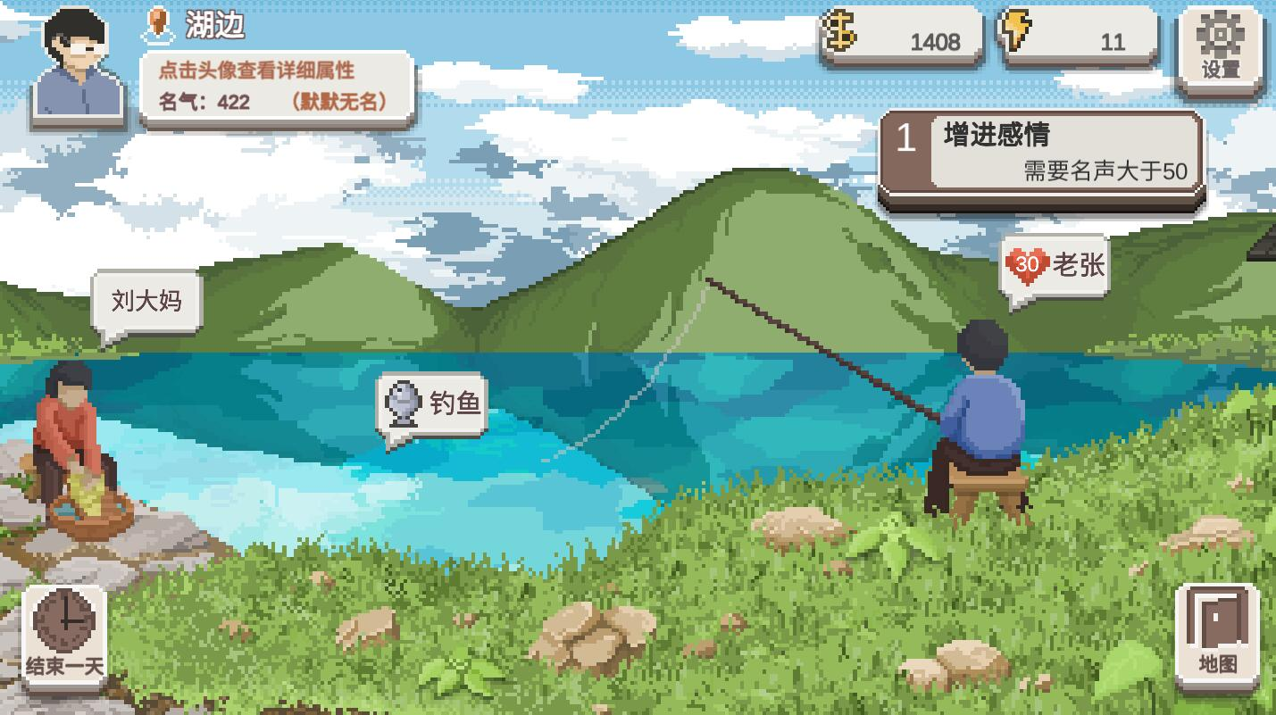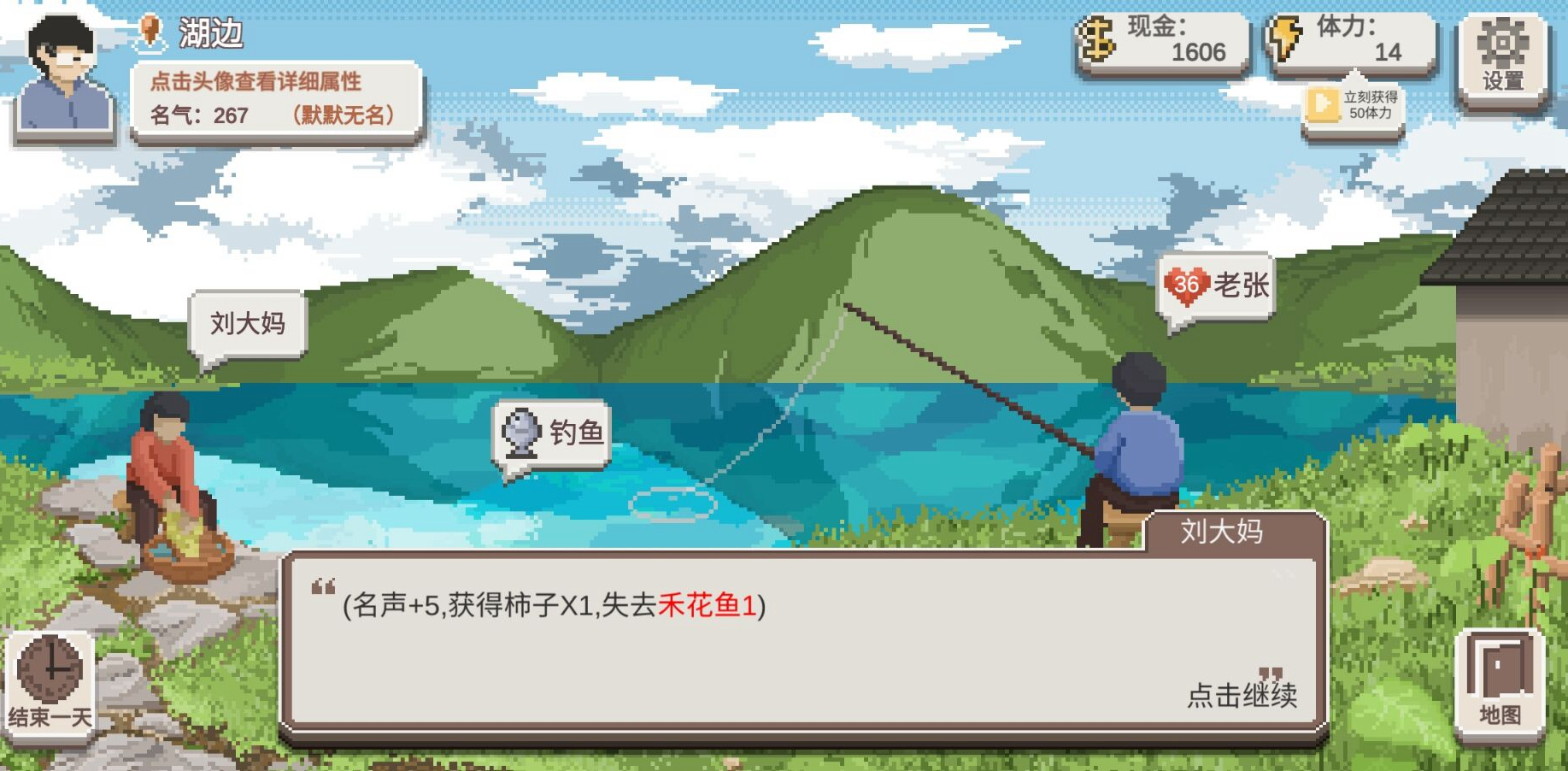 【老张】则可以花费8精力向他请教钓鱼的经验,能够增加一定(+10)的钓鱼经验和【老张】的好感度,有时候他也会送你鱼