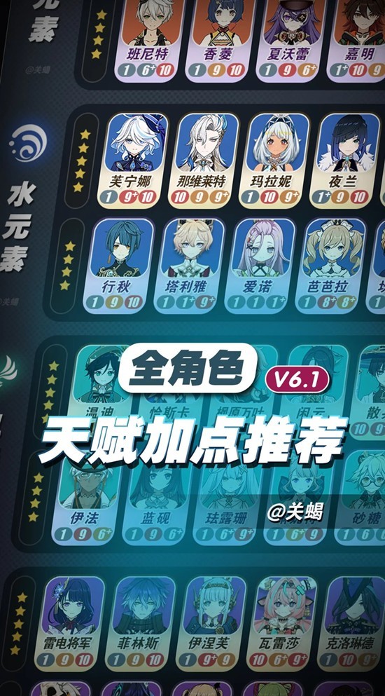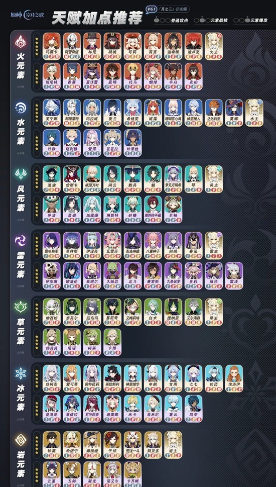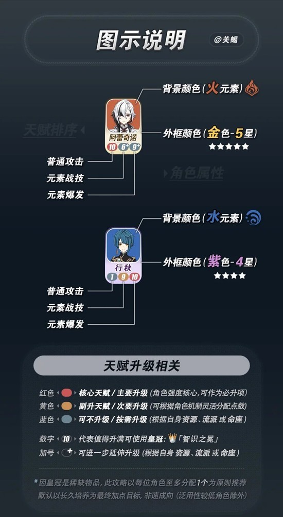 • 表格均按照全角色各自的机制特点推荐升级天赋点数,一般适合正在计划全角色培养的旅行者,合理分配培养资源和皇冠,或者查询某个角色的天赋加点参考方向的使用。