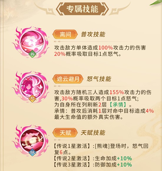 在培养方向上,貂蝉初始生命与防御属性较为扎实,适合部署在中后排位置。其天赋【熊魂】可在登场时立即获得6点怒气,加快技能循环启动速度。因此在资源分配时,优先提升怒气回复效率、生命值加成与防御属性,有助于她更快释放技能并提升存活率。装备选择上,建议优先强化防御类石装与宝符,搭配具有免伤或怒气回复效果的饰品,确保她在战场上的持续影响力。