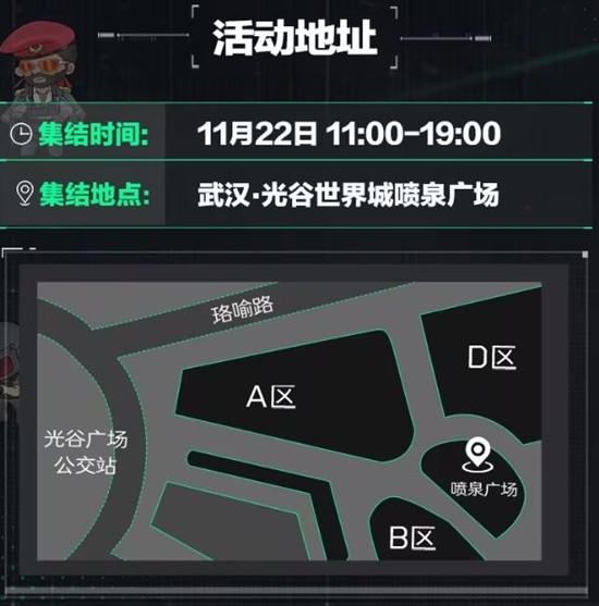 活动将在武汉光谷世界城喷泉广场举行,集结时间为11月22日11:00-19:00。现场将分为A区和B区,观众可以根据指引前往相应区域。