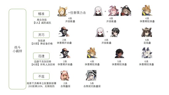 没写的几个,突袭居然加生命,死不掉的话打完第一波就开始挂机发呆,只有42可以自烧血不过满场飞很好玩吧,想玩的话建议同时叠不屈或助力,为什么把减再部署放助力里面啊