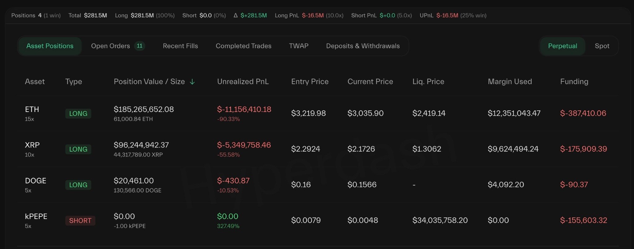 ETH仓位亏损超1100万美元,DOGE呈现亏损状态,资金费率全面为负,账户未实现亏损总额已超1650万美元。交叉保证金系统在总权益持续缩水时,不会机械等待理论强平价位——而是实时监测剩余缓冲资金能否覆盖所有资产篮子的风险。