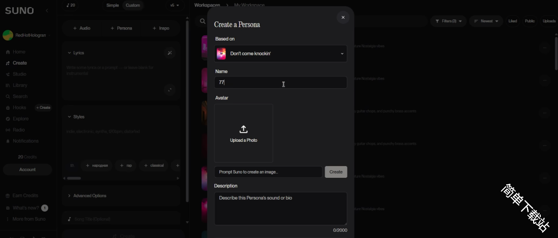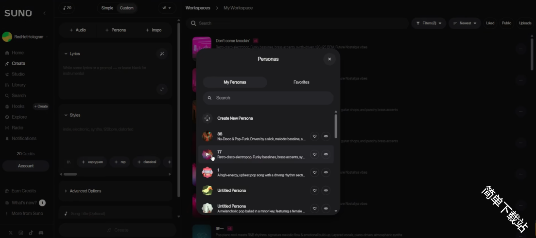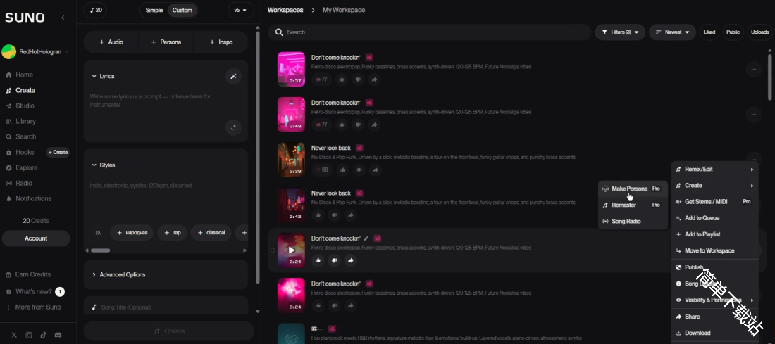 在Suno中找到需要修改保留旋律的歌曲,点击后选择三点设置中的make persona,新建一个persona并保存,并在persona处选择好已保存的,在输入框中更改自己想要修改的歌词,曲风不变,在高级选项中还可选择声线。然后就可以在保留原本旋律的基础上成功的修改歌词了。
