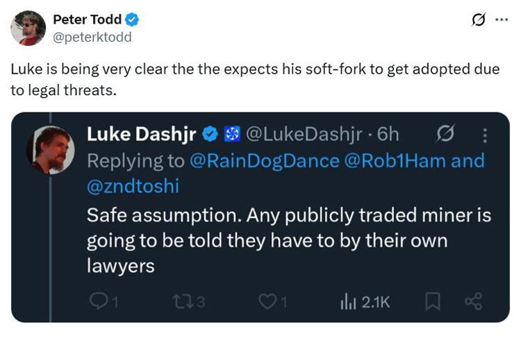 加拿大密码学家、计算机科学家Peter Todd也晒出Dashjr截图,并评论称,“很明显他希望自己的软分叉能因法律威胁而被采纳。”
