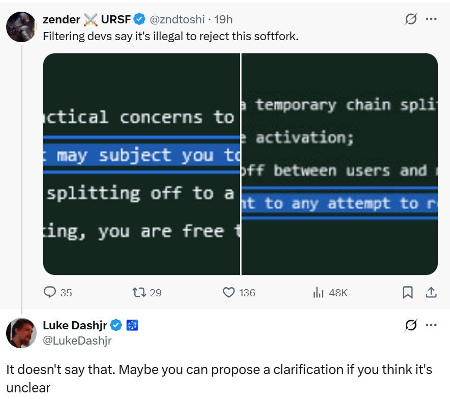 Dashjr本人也似乎支持这一观点,他在回应某用户有关拒绝软分叉违法言论时表示:“并没有这么说。如果你觉得表述不清,可以提出澄清建议。”