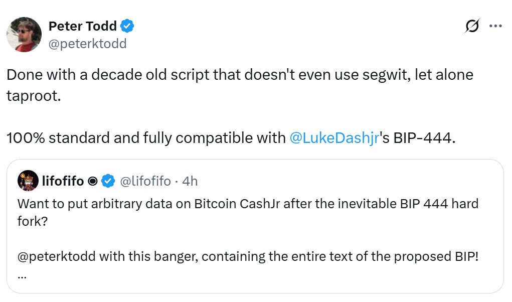不过Todd或许已经找到了利用该修复方案的方法。他声称自己记录了一笔包含整个拟议文本内容、且“100%标准且完全兼容”于本次改进提案的交易。