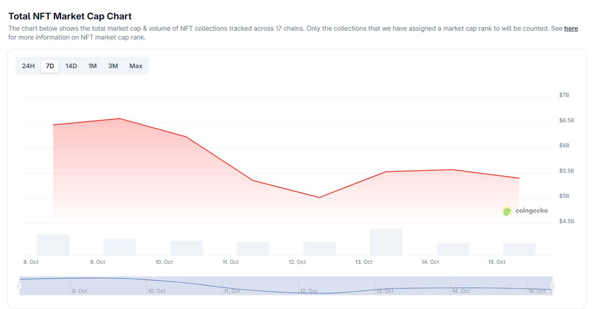 CoinGecko数据显示,该板块总估值于周五从62亿降至周六的50亿。所有区块链网络上的数字藏品市值几乎减少了20%,即约12亿。