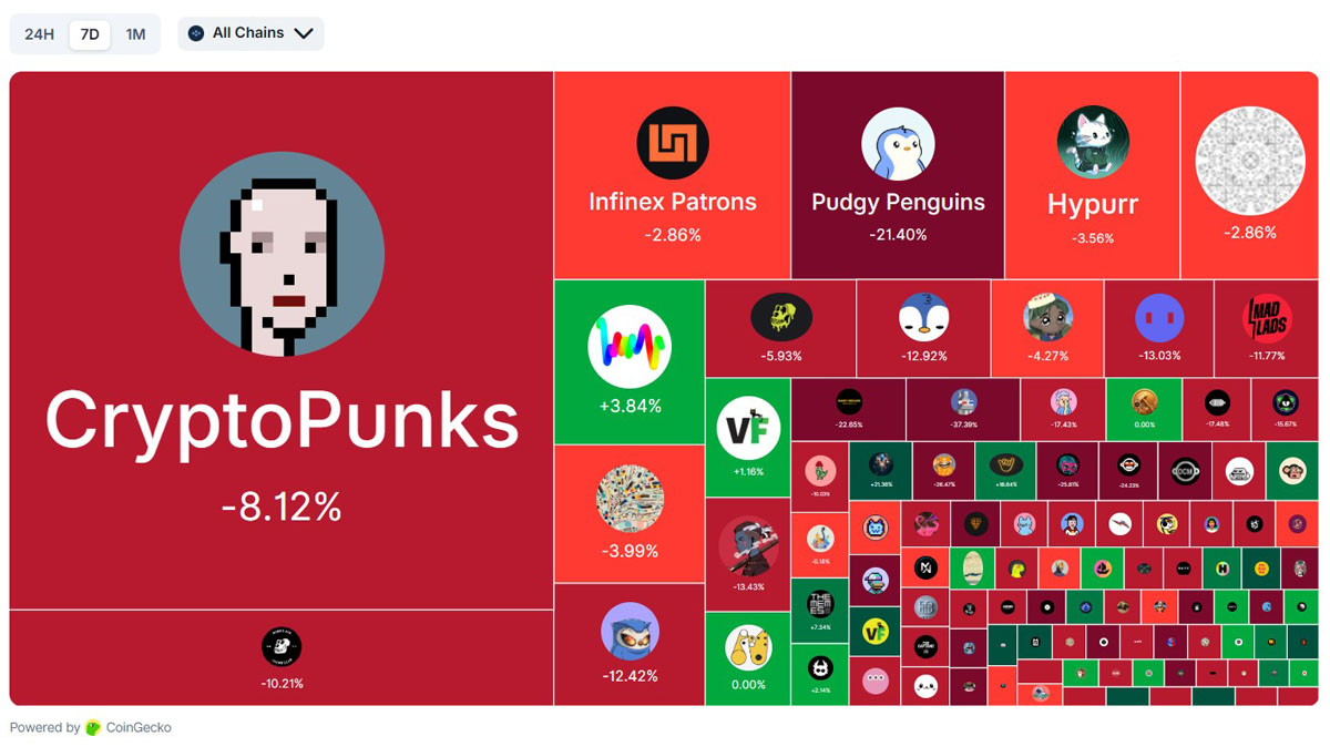 CryptoPunks作为市值最高的NFT系列,周线下跌8%,三十天表现下跌近5%。