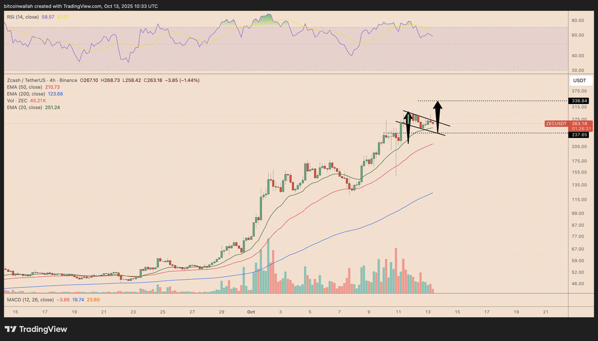 如果买家将价格推升至旗形的上趋势线之上,ZEC可能确认看涨突破。这一举动将为10月设置一个技术价格目标,接近336美元,比当前水平高出约25%。