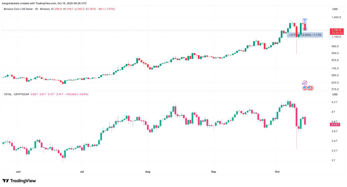 自周一创下1,300美元历史新高后,BNB已下跌13%。市场关注该币安生态代币的上涨行情是否已告终结。