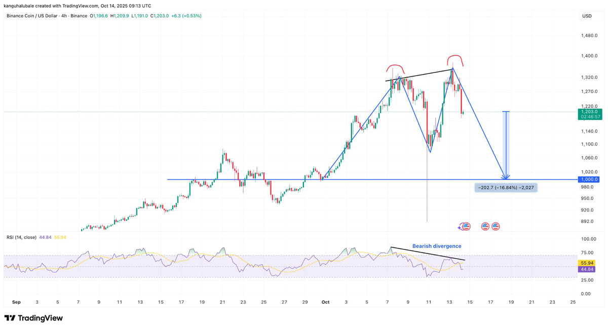 超卖RSI与看跌形态显示,在下一轮上涨前,BNB将出现短期回调,下行目标区间为800至1,000美元,