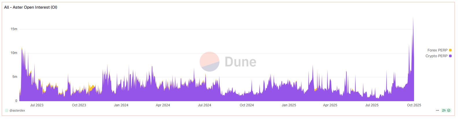 其中实力最强劲的就是BNB Chain上的Aster,不仅短时间内夺走了Hyperliquid长期占据的去中心化衍生品市场份额第一的宝座,还在日交易量等数据方面领先了10倍左右。