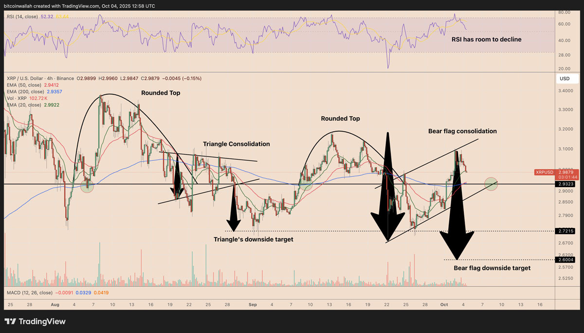 在四小时图上,XRP形成了另一个圆顶形态,并在看跌旗形中整合。这种结构通常会导致价格下行幅度接近旗形上下轨之间的最大距离。