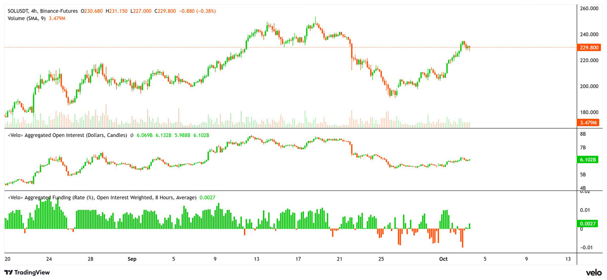 SOL价格、总未平仓合约量与资金费率。来源:Velo.data