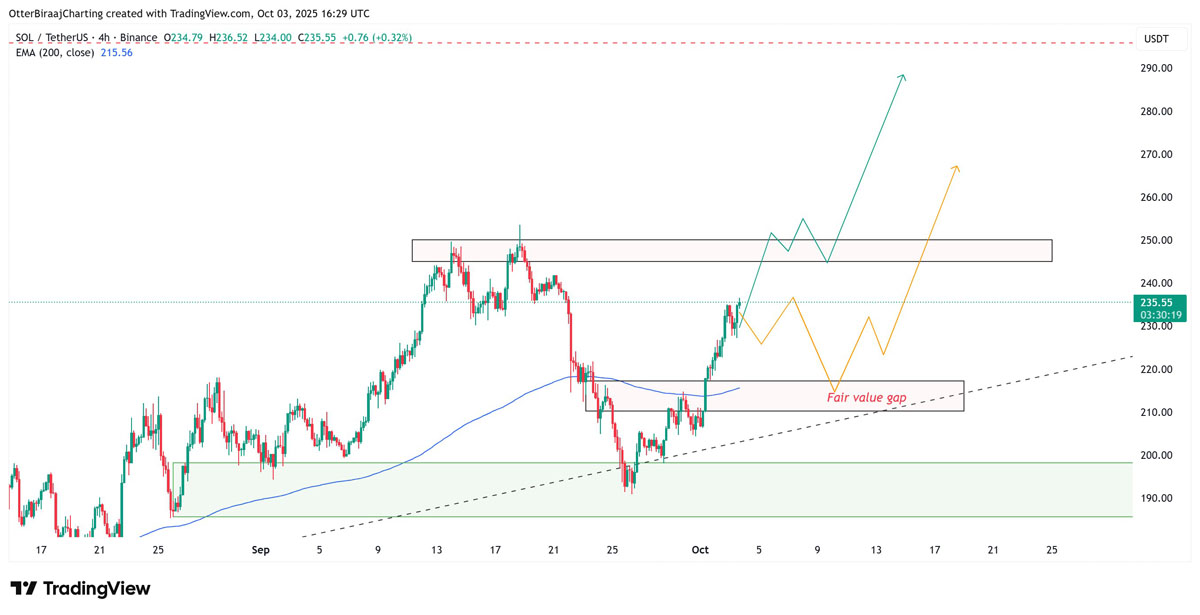 SOL的短期走向取决于散户信心能否恢复。下行情景中,价格回撤至218-210美元区间并不会破坏整体看涨结构,因为这将重新测试四小时图上的公允价值缺口(FVG),同时触及200周期指数移动平均线(EMA)支撑。