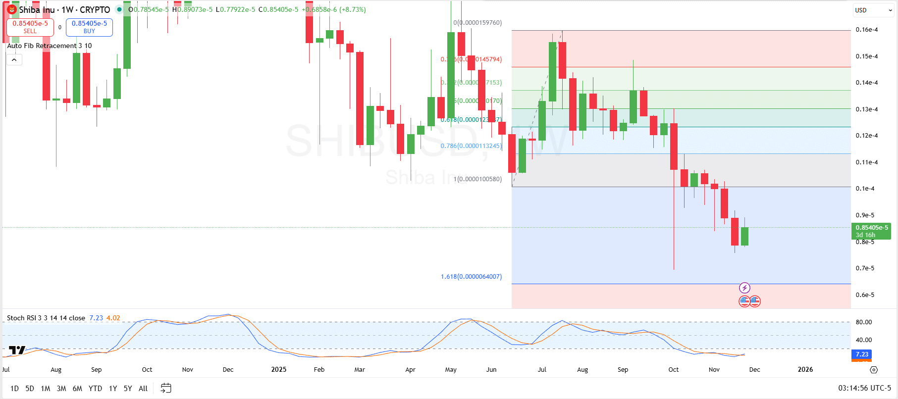 随机RSI指标显示动能衰竭而非确认反转。双线深入超卖区(读数7与4),表明下行动能虽延续但未形成强力金叉。除非SHIB能收复上方0.786等关键斐波那契位,否则短期反弹仍属周线下行趋势中的修正。