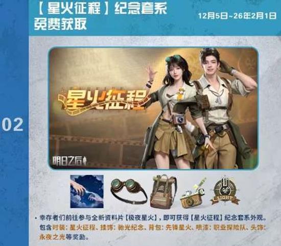 【星火征程】纪念套系外观免费获取,包括时装、挂饰、背包、喷涂、职业探险队、头饰、永夜之光等奖励。
