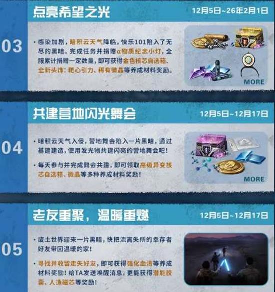 暗积云天气入侵,营地舞会陷入一片黑暗,通过基建建造,使用荧光物共建闪亮的营地舞会吧!每天参与并完成舞会共建,即可领取高级异变核芯自选箱、微晶等多种养成材料奖励!