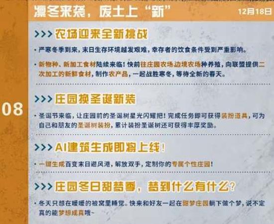 12月18日,严寒冬季到来,末日生存环境越发艰难,幸存者的饮食条件受到严重影响。新物种、新加工食材陆续来临!快前往庄园农场边境农场种养殖,向联盟提供二次加工的新食材,制作农产品,一起战胜寒冬,等待全新的春天。