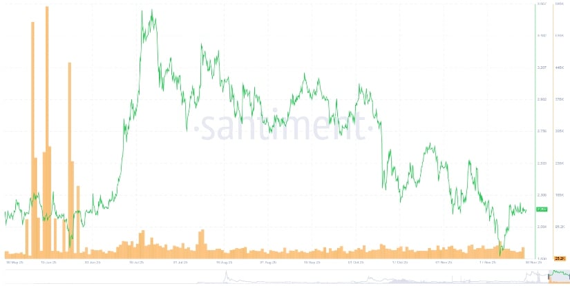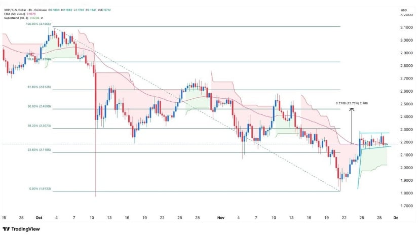 截至2025年11月30日,Brave New Coin数据显示XRP现价2.18美元。尽管恐惧贪婪指数25反映整体市场情绪偏空,但分析师认为若能突破2.20-2.30美元阻力区,当前2.15美元上方的盘整或为更大行情奠基。