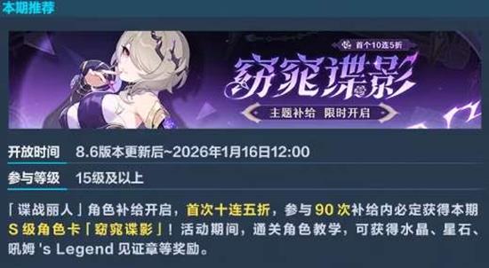「窈窕谍影」主题补给:开放时间:8.6版本更新后至2026年1月16日12:00参与等级:15级及以上活动内容:首次十连五折,参与90次补给内必定获得本期S级角色「窈窕谍影」。