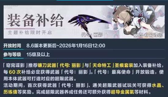 装备补给:开放时间:8.6版本更新后至2026年1月16日12:00参与等级:15级及以上活动内容:每60次补给必定获得超限武器「代号:丽影」或「代号:天命特工」。