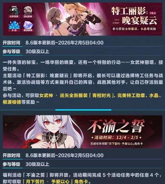 特工丽影:晚宴疑云:开放时间:8.6版本更新后至2026年2月5日04:00参与等级:30级及以上活动内容:通过选择特工任务与战术体,激活协战链等方式提升自己的阵容,战胜其他对手。