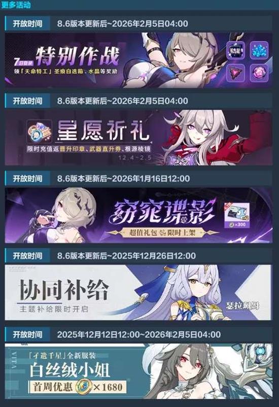 协同补给:开放时间:2025年12月12日12:00至2026年2月5日04:00活动内容:主题补给限时开启,参与获取全新服装「白丝绒小姐」等奖励。