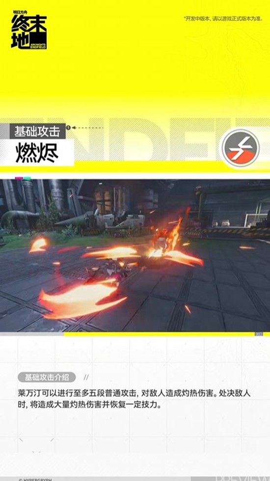 菜万汀可以进行至多五段普通攻击,对敌人造成灼热伤害。处决敌人时,将造成大量灼热伤害并恢复一定技力。