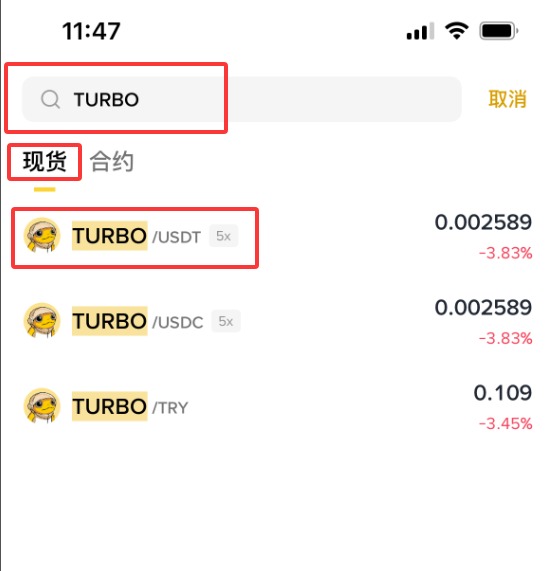 输入TURBO关键词,选择【现货】页面的【TURBO/USDT】交易对