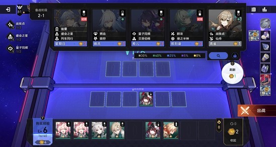 有50左右金币开始把“除砂金外”的任意一个二费角色刷到三星,比如:卡芙卡。那么现在就把卡芙卡凑齐三星放在上面,卡芙卡三星后,商店不会再刷出卡芙卡。每次只集中刷一个三星!!!!其他还是二星就卖掉。