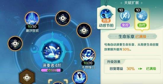 乐师后期的核心爆发来源于超阶音符与演奏时刻这两个技能。演奏时刻是至关重要的输出手段,在前期加点时就应优先提升其效果。同时,乐师在暴击概率与暴击伤害方面的属性也需要通过天赋进行补强。当暴击相关属性得到足够提升后,不仅能弥补乐师在其他方面的辅助能力短板,也能让他在后期构成强力的阵容核心。