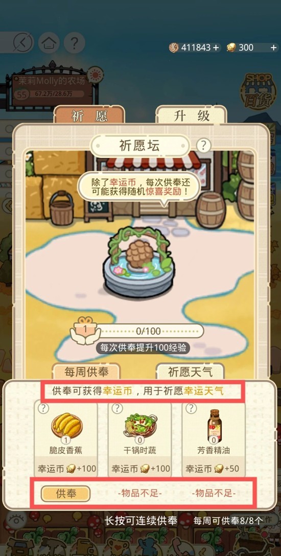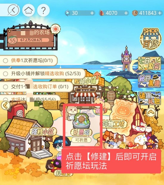 ①祈愿坛经验达到一定数值,满足农场等级条件,即可花费农场币提升祈愿坛等级。