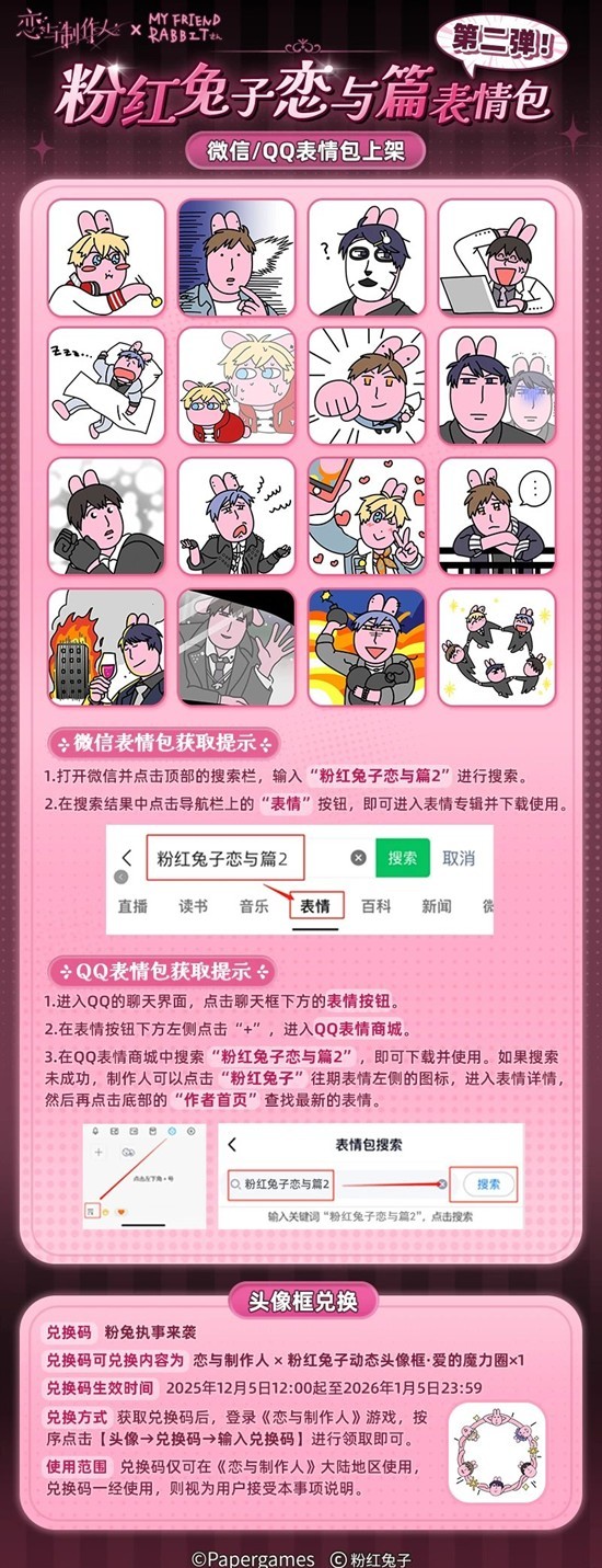 即刻起~1月15日23:59,在游戏内输入兑换码【粉兔执事来袭】,即可免费获得恋与粉红兔子二联动态头像框【爱的魔力圈】!