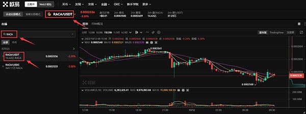5.左侧菜单选择RACA/USDT交易对,查看实时行情数据
