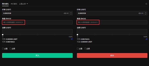 6.输入购买数量点击买入(最小交易量为1000RACA),卖出操作同理填写卖出量即可。