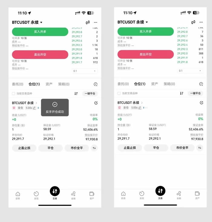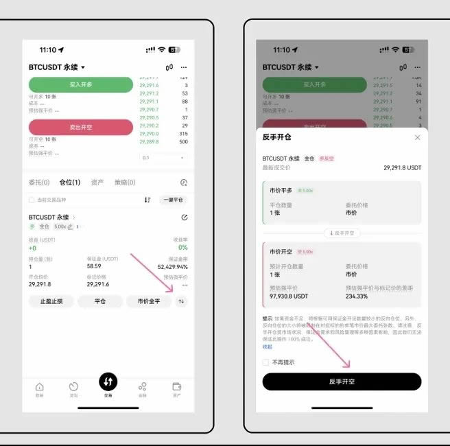 2.在持仓页面,点击【反手开仓】按钮。确认弹窗中将显示平仓与开仓的详细信息,包括交易数量、委托价格等。确认无误后点击【反手】完成操作。
