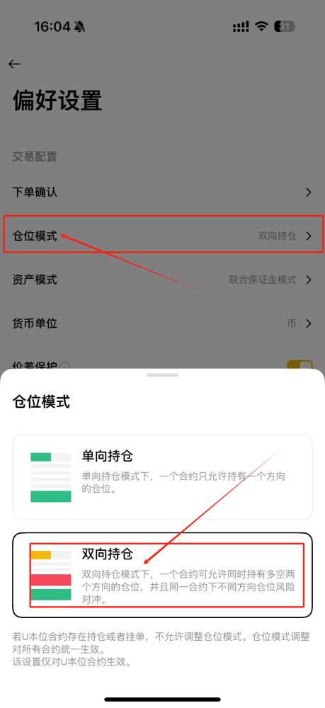 3. 在仓位模式中选择"双向持仓"选项