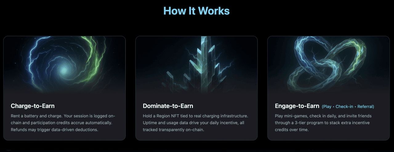 平台提供三大核心机制:设备租赁的「充电赚取」、区域NFT持有的「主导赚取」以及游戏化「参与赚取」。其EaaS市场支持将充电宝代币化为NFT,兼容Web2/Web3登录,并实现多链桥接与活动加权质押治理。