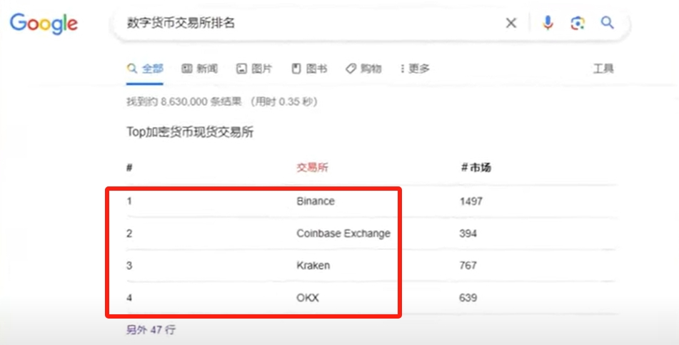 我们在谷歌搜索虚拟币交易所排名就可以看得出,第一个是币安,第二个是coinbase,第三个是kraken,第四个是OKX。