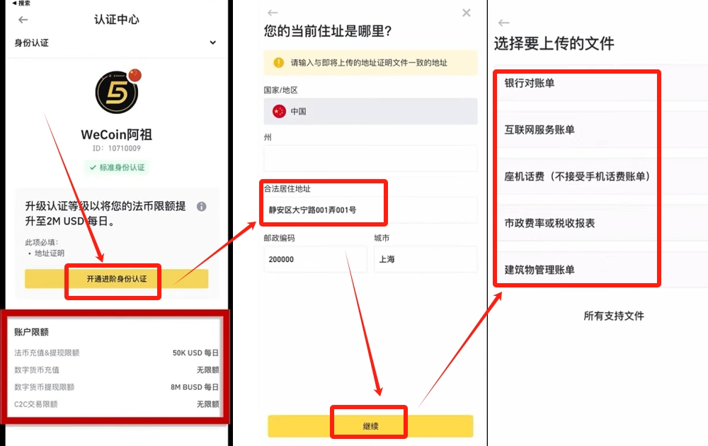 标准身份认证每天的法定货币提钱限额是5万美金,虚拟币每日提钱限额是800万美金。至于进阶身份件需要地址证明,我们点开看一下都需要什么。先填写我们的住址,点击下面的【继续】,能够证明地址的文件有银航对账单、座机、话费单、报税表、物业单等东西,大家可以自由选择种类提交。而我并不想让交易所知道我这么多东西,并且每天800万美金对我足够用了,所以暂时就不用认证了。